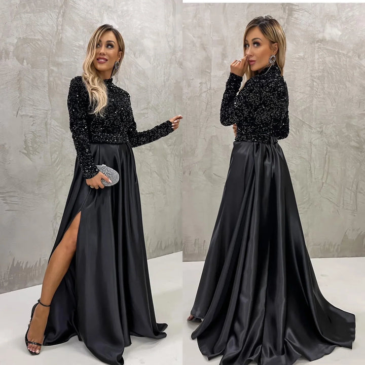 L'abito Sara è un elegante abito con maniche lunghe e paillettes che si adatta perfettamente alle curve del corpo, aggiungendo un tocco di eleganza. Lo spacco laterale rende l'abito unico e perfetto per ogni occasione.