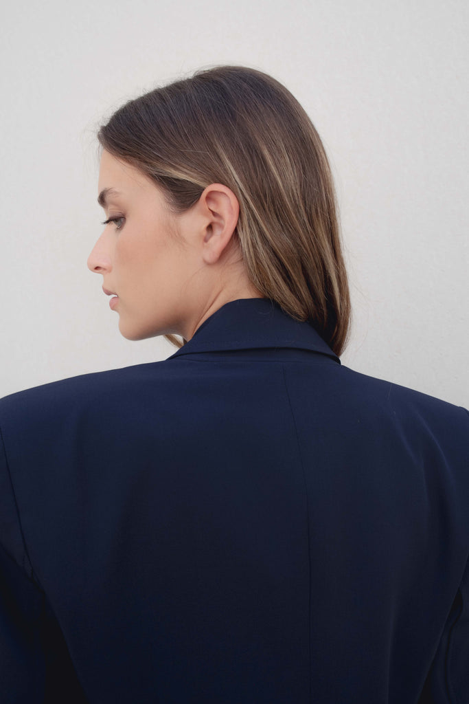 Blazer doppiopetto con collo a revers e maniche lunghe rifinite con spacchi e bottoni. Tasche anteriori con patta e tasche a filetto sul petto. Interno foderato. Chiusura frontale doppiopetto con bottoni.