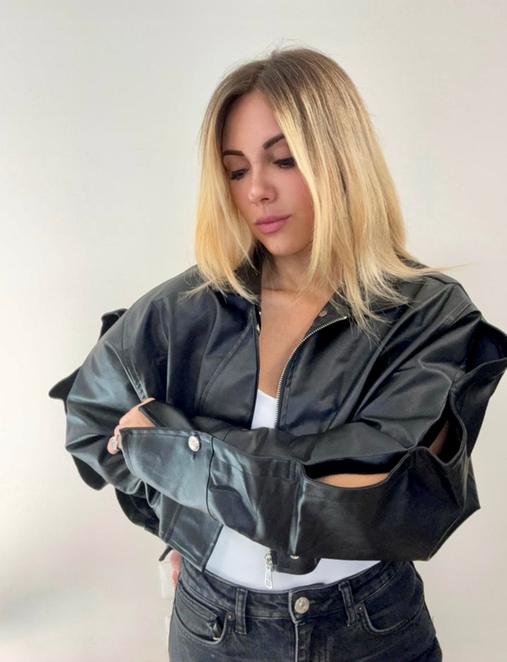 Giubbino in ecopelle nero con dettagli cut-out, caratterizzata da un design moderno con aperture laterali a onde che donano movimento e originalità al capo.
