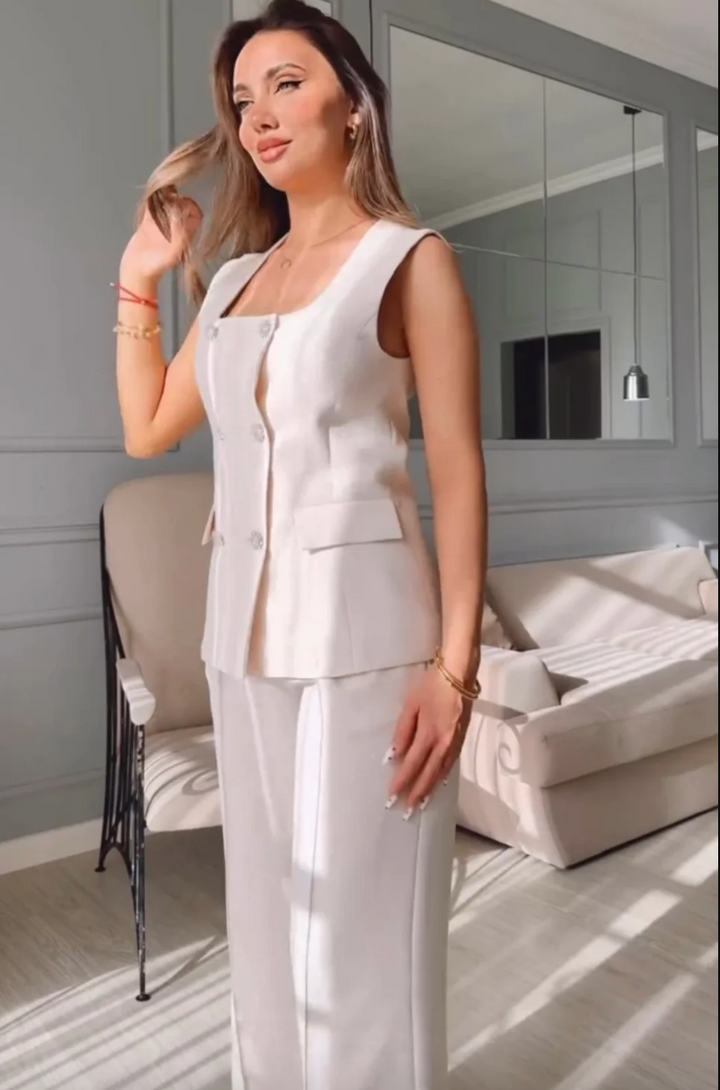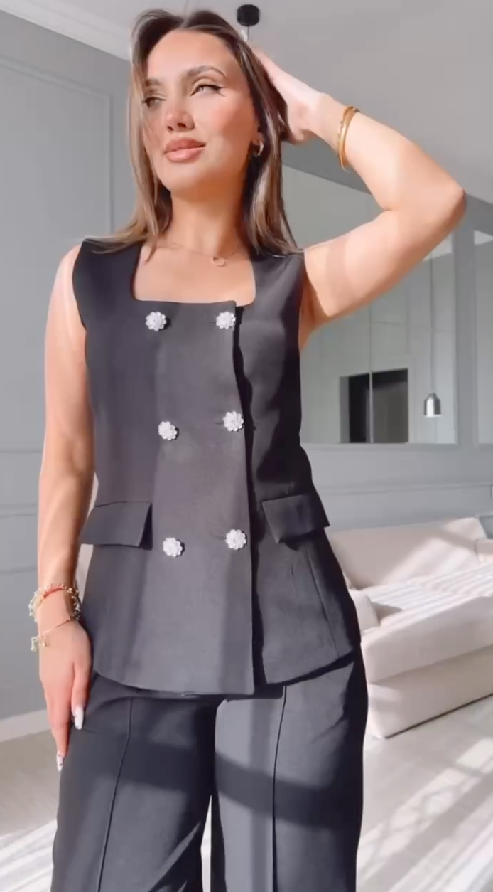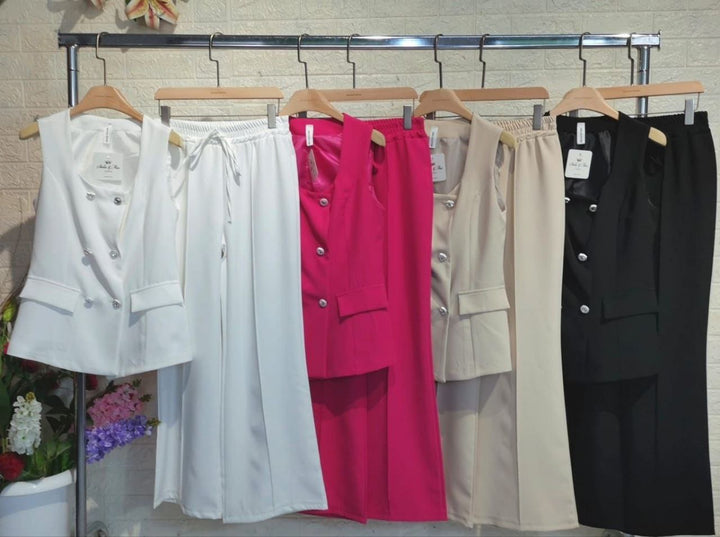 Il Tailleur Enduring Grace è una scelta elegante e alla moda per ogni occasione. Presenta un raffinato pantalone a palazzo con una comoda molla al girovita, abbinato a una giacca a giomanica con dettagli in cristallo per un tocco di lusso. Versatile e di alta qualità, il Tailleur Enduring Grace offre un look sofisticato e impeccabile.