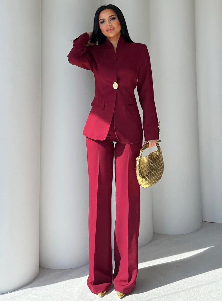 Il Tailleur Kedhira combina eleganza e dettagli raffinati, con bottoni in oro Zuzu Claret Red che aggiungono un tocco di classe unico. Realizzato in doppia crepe importata, garantisce una morbidezza e una vestibilità impeccabile. La giacca lunga 70 cm e i pantaloni da 110 cm sono foderati internamente e dotati di tasche pratiche per il massimo comfort. Dettaglio esclusivo è il bottone oro sulle maniche, che completa un look sofisticato e moderno, perfetto per chi cerca stile e qualità senza compromessi.